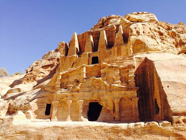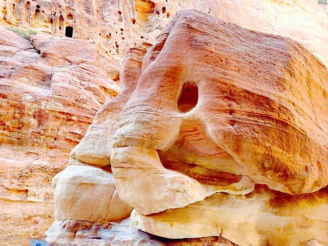 通往佩特拉的必经之路是一条长约1.5公里的狭长的峡谷通道。进入峡谷,可以看到在岩壁上的许多空洞,这是一些凿岩而成的墓碑群。这些墓碑群根据埋葬者身份的不同而规格不一,雕刻的图案也各不相同。