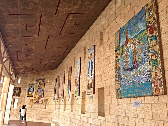 教堂外的长廊里布满了全球各地送给圣母报喜堂的反应了以圣母报喜为主题的艺术作品,有纽约的现代艺术,拜占庭时期的马赛克风格及亚洲的民族风格艺术。