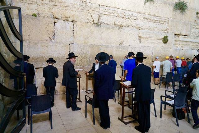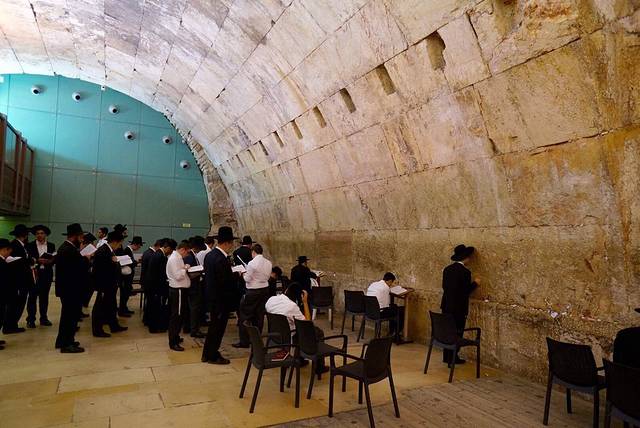 哭墙分为两部分,中间隔一栅栏,男女分开祈祷。入男部,须带上用纸做的小帽,否则被视为异教徒而不准入内。在做正式祈祷时,要准备好两个装的“圣书”语录的小羊皮袋子,一个戴在头上,另一个捆在手壁上,身上披一件特制的披肩。教徒们在祈祷时,面对哭墙,口中念念有词