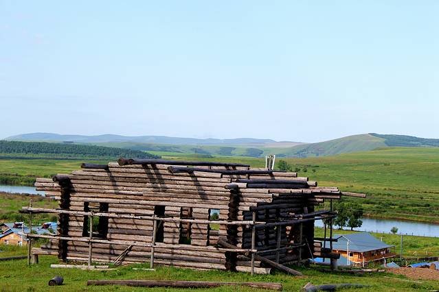 木刻楞的建筑方法,主要是用木头和手斧刻出来的,有楞有角,非常规范和整齐,所以人们就叫它木刻楞房。修建木刻楞房的第一步是要打地基,地基都是石头的,而且要灌上水泥,比较结实。第二步就是盖,把粗一点的木头放在最低层。一层一层地叠垒,第二层压第一层。修建木刻楞房一般情况下不用铁钉,通常都用木楔,先把木头钻个窟窿,再用木楔加固。 建木刻楞的传统方法是要垫苔藓。苔藓垫在中间,好处在不透风。冬天零下30℃到40℃,有了苔藓压在底下,等于是水泥夹在隔缝里一样,不透风,冬天非常暖和,而夏天又非常凉快。