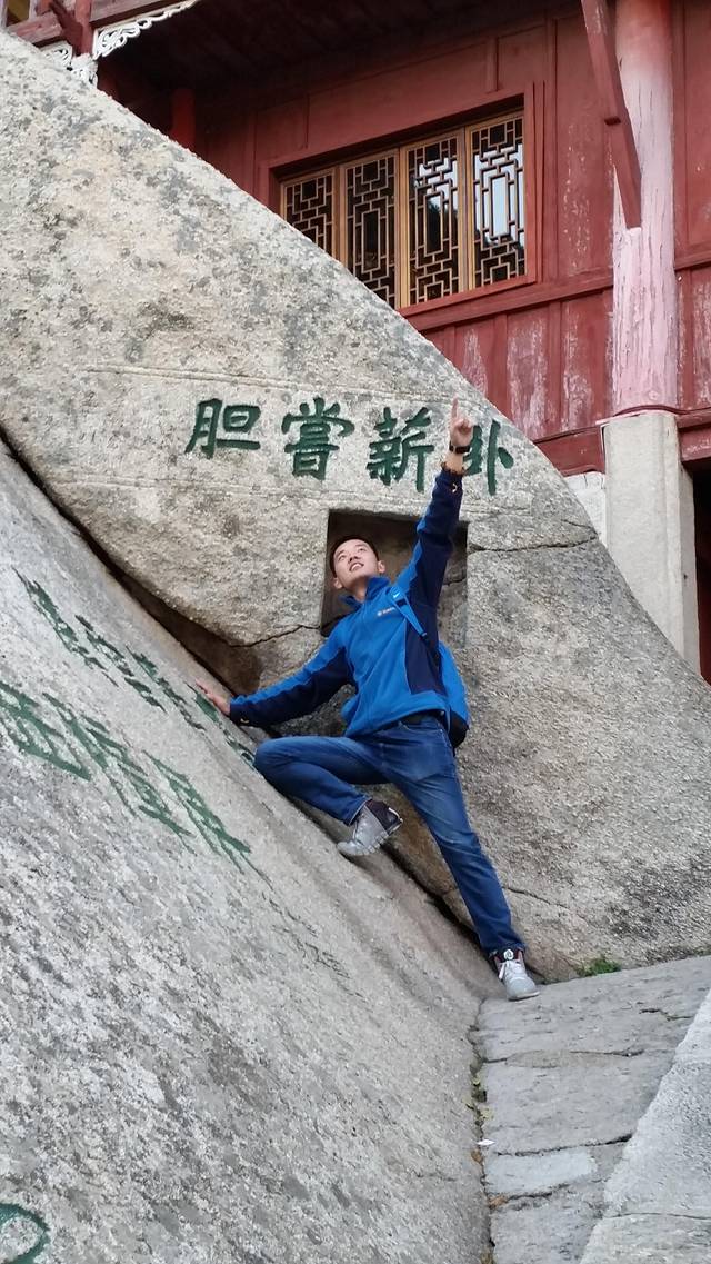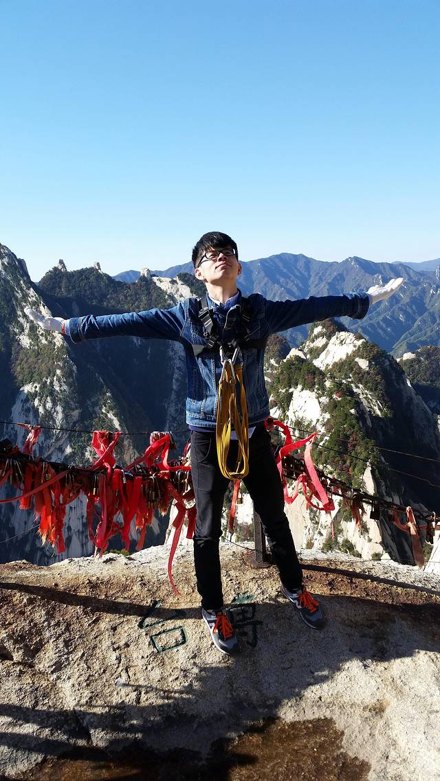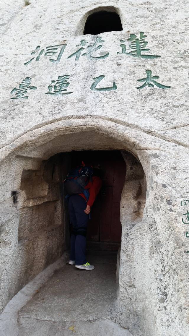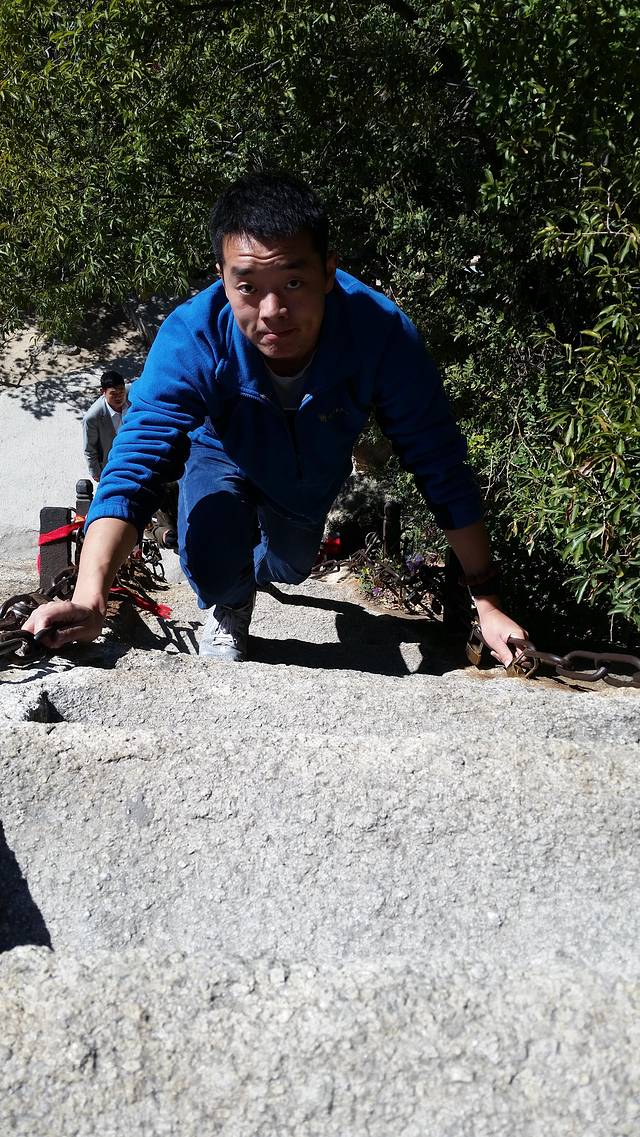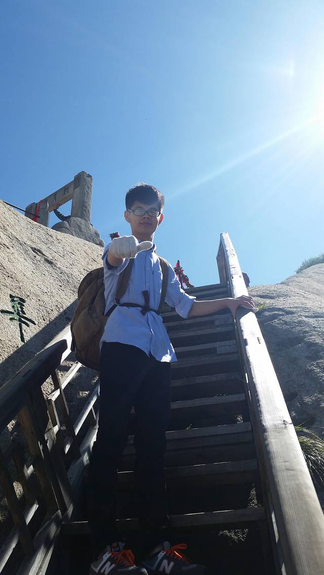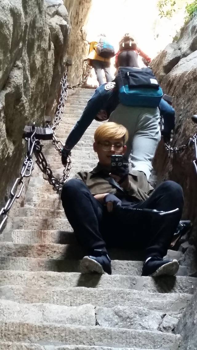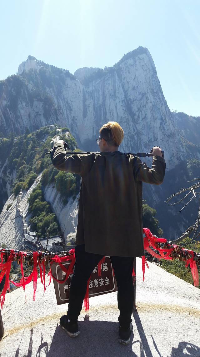 在回心石附近又正式捡了个猴哥,因为他10日要登顶索道下山,咱们休息很少,紧赶慢赶的要在日落前至长空栈道。猴哥还是个大学生,一件网式涤纶速干衣,一件外套,背了个皮包,一个登山杖,满头金发,老气横秋,但可幼稚了,可好玩了,他居然自由行了国庆七日,还游了西安,10日还和我们爬华山,真的是轻装简行,臭是自不必说。