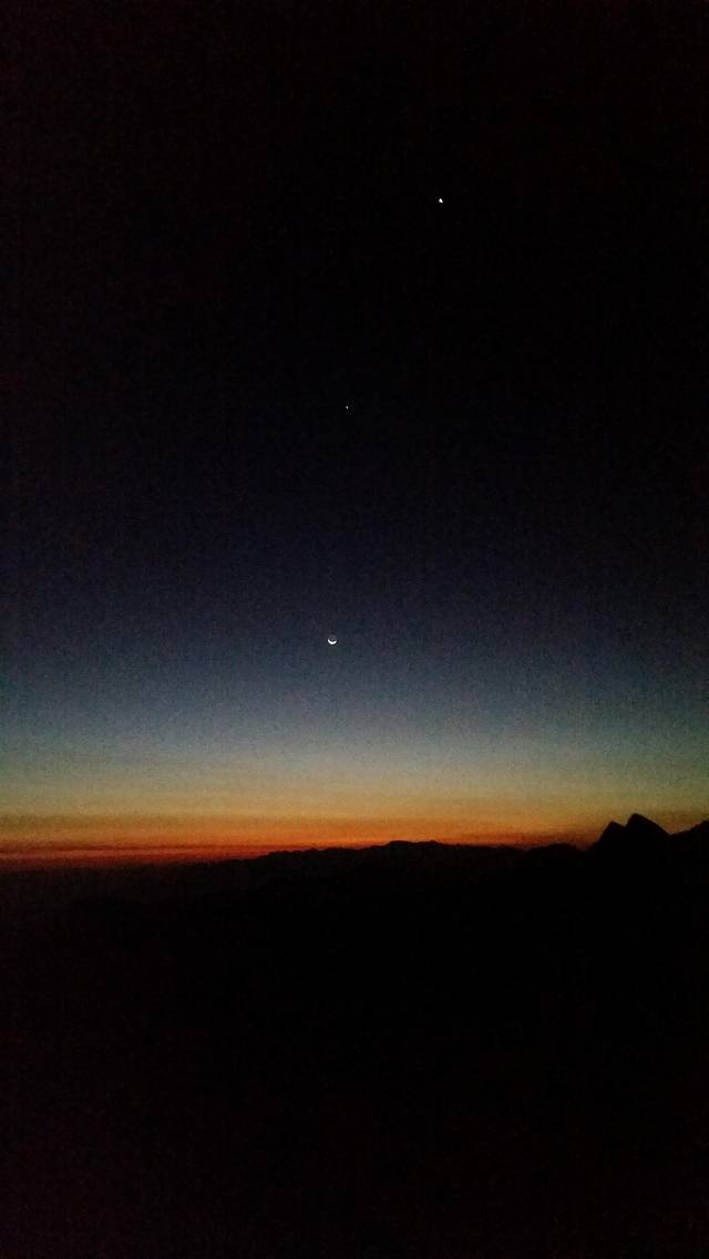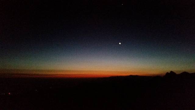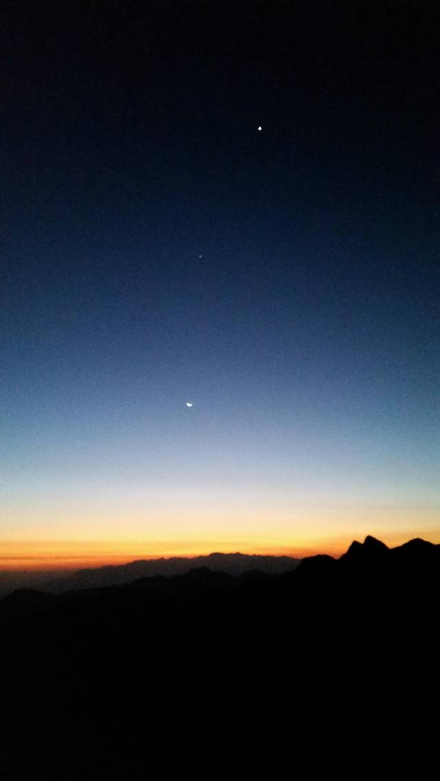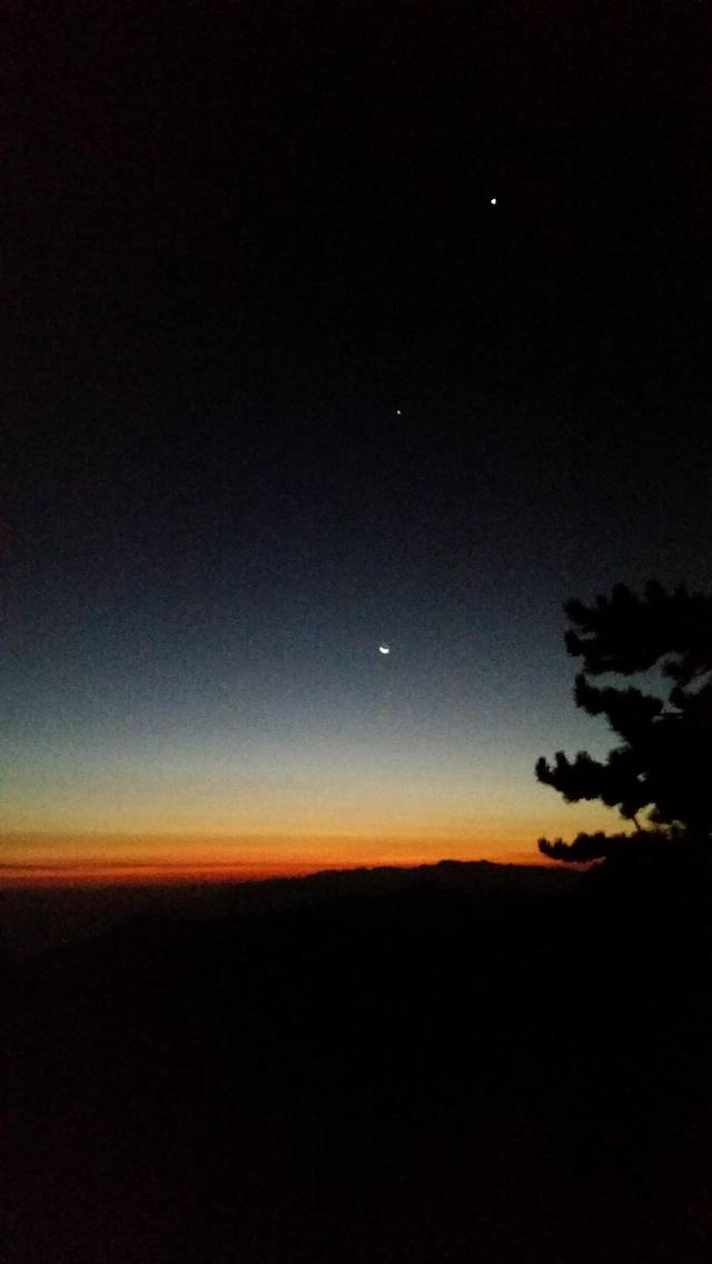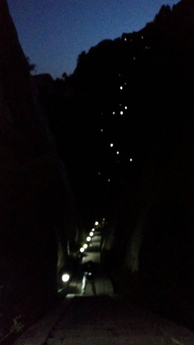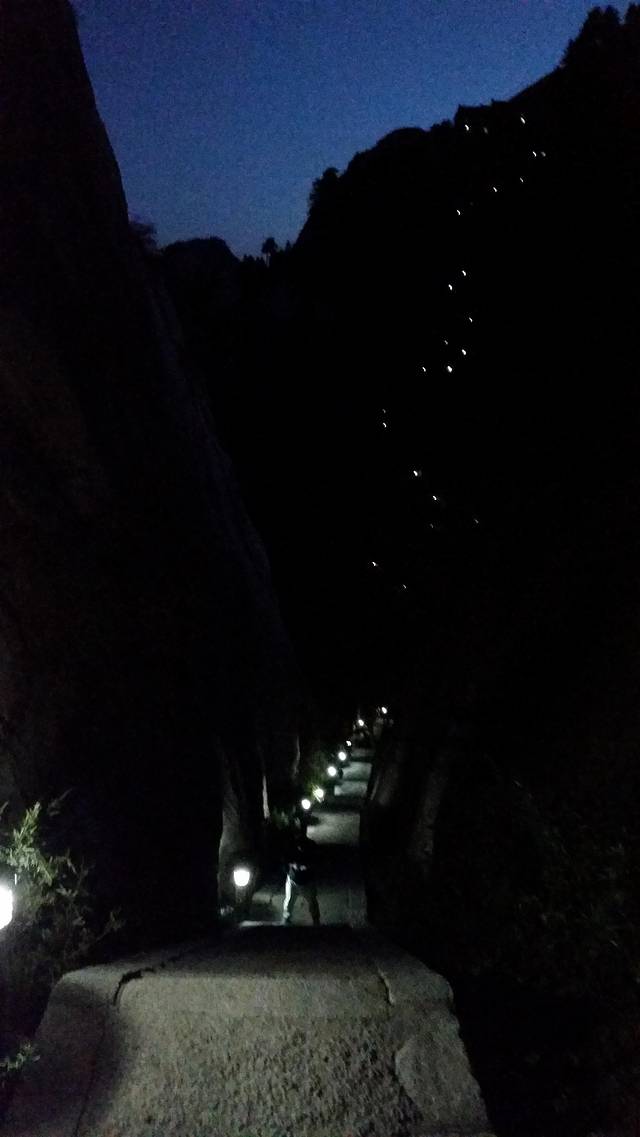 太阳一落,很快天就暗了下来,路灯形成弯弯曲曲的夜龙,我们过中峰,至天梯,过观日台就到了今晚最终的目的地华山东蜂的东蜂饭店,又称金凤饭店(东峰店,西峰还有一个同名的),我们之前在网上预订好了十人间一百五一个床位,现场有八人间,但是你如果现场来不是很早的话,早就没床位了,所以网上订是明智的,网站会把预付的房费在你入住以后退给你,你在现场要缴纳二百五十块,有一百是押金。这里还可以租军大衣,五十元一件,押一百。我们寝室四女六男,东峰饭店可以吃馒头、炒菜、方便面、米饭等,但价格你懂的二三十至五六十为起步价。我们同行小L死活要请客,真是感动哭了,真是何等的情谊建立了信任啊。房间有热水瓶一个,可以到登记入住的地方打热水。下铺很潮湿,如果可以垫一床被子睡,不然就挑上铺。晚上会有打鼾的磨牙的脚臭的,所以你可以被耳塞、口罩、眼罩,其实爬了一天山了真的很累了,这一夜真的会很快入睡,除非你真的很恋床,恋自己的床。有街水的地方很冰的水给你刷牙洗脸,但是你要想洗脚洗澡就不要痴心妄想了,黑夜做梦了。因为我们到时几天晴空万里,所以今夜星星也是格外闪烁,我所居住的城市看星星很容易,所以也就没留心,我对看星象也不懂。同屋的姑娘倒是去了两三个。冷得不行回来了。这里来说说厕所,华山大多数厕所都是日本研发的移动式,虽不是十一,但也不能说人少,但上厕所还是不多的,山上比较干燥,应该很多人和我一样便秘不用上大号的。东峰饭店的厕所就在进旅馆门口,说远不远,但是外面太冷,上厕所也是种考研的。下面来说充电的问题,房间会有几个插座,大家商量着用吧,充电宝真的是不错的携带。最后说说搭帐篷,真的很冷,我也就只能说这么多了,还是房间温暖,我睡门口,把门关上,晚上我还出汗,房间都是大家呼出的二氧化碳比较温暖,本来穿着睡的,最后还脱了好几件,十月这个季节,爬山俩件速干衣,换着穿应该是够了,夜晚一件冲锋衣,一件较厚的裤子,爬山的手套带着睡,冬天的厚袜子,基本是够了,略微有些寒意,但你要在户外不动,那还得加毛衣之类的。