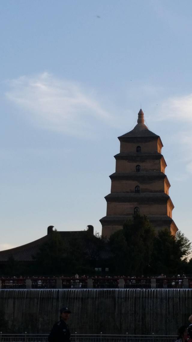 出历史博馆,夜幕已缓缓拉开,我们继续前行,不到十分钟就到了大雁塔音乐喷泉的广场上,此时已是下午六时左右,我9月已来目睹了这里夜间的风采,此时天还微微有些光亮,小L运气不错,此时音乐喷泉即将开始,大家来欣赏一下吧。