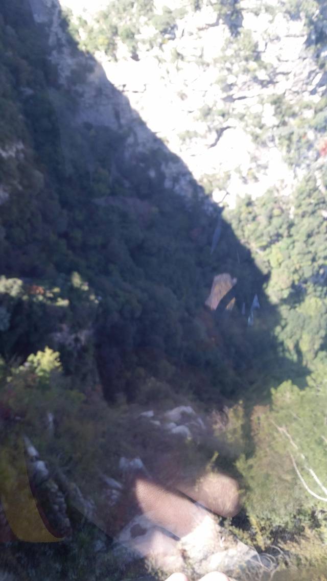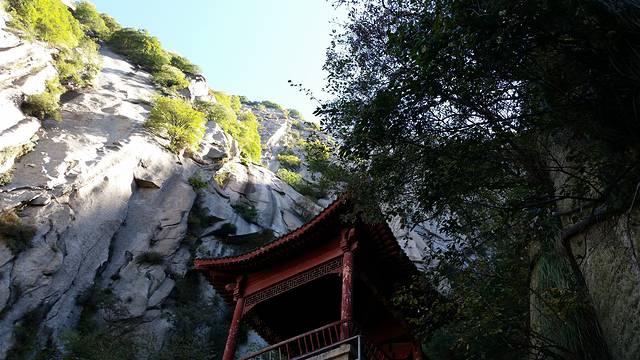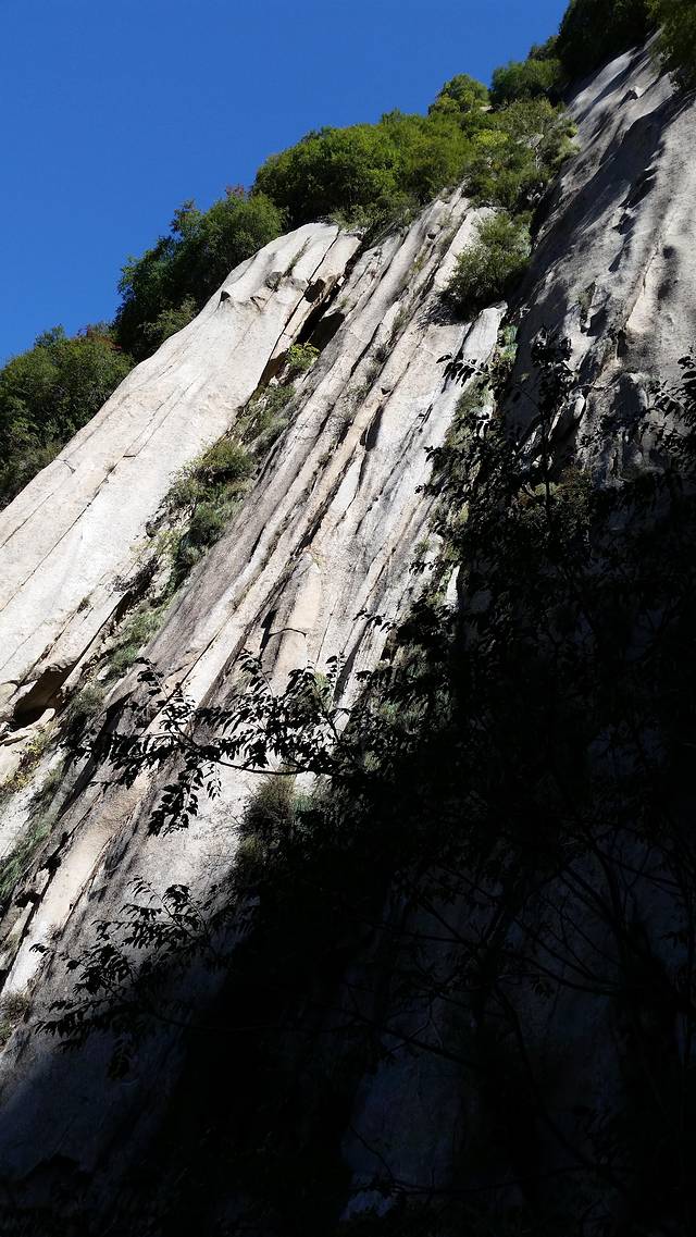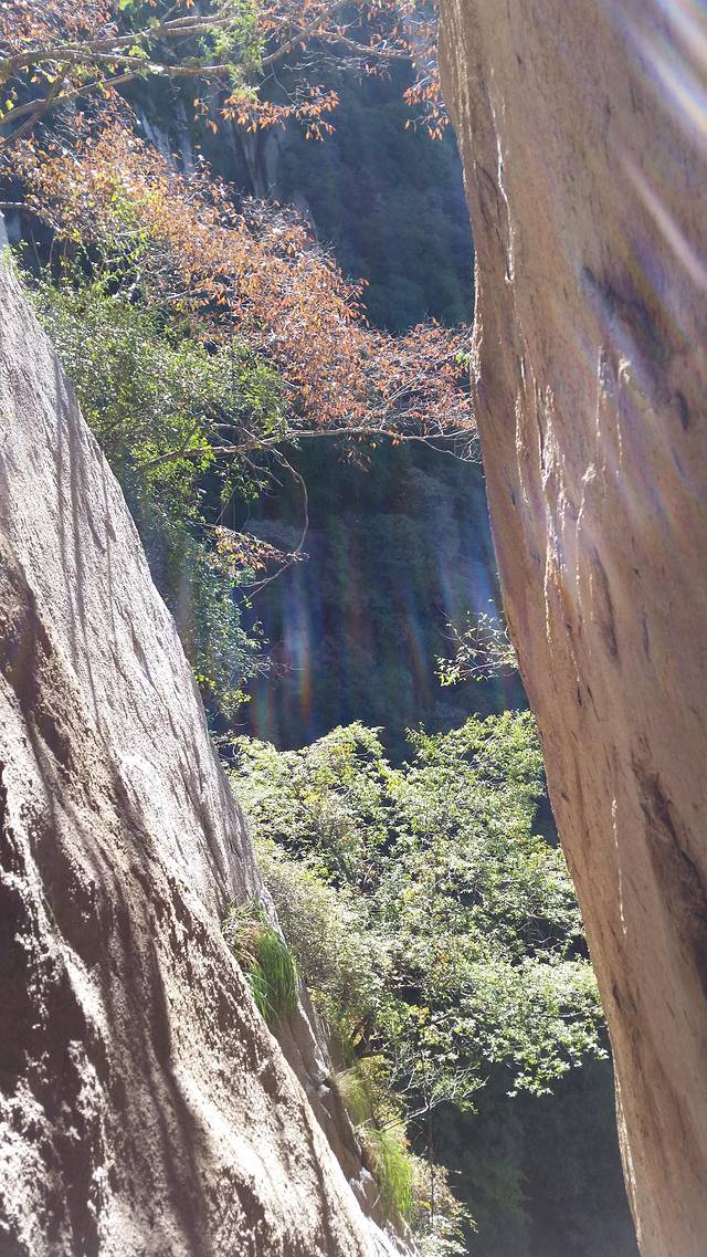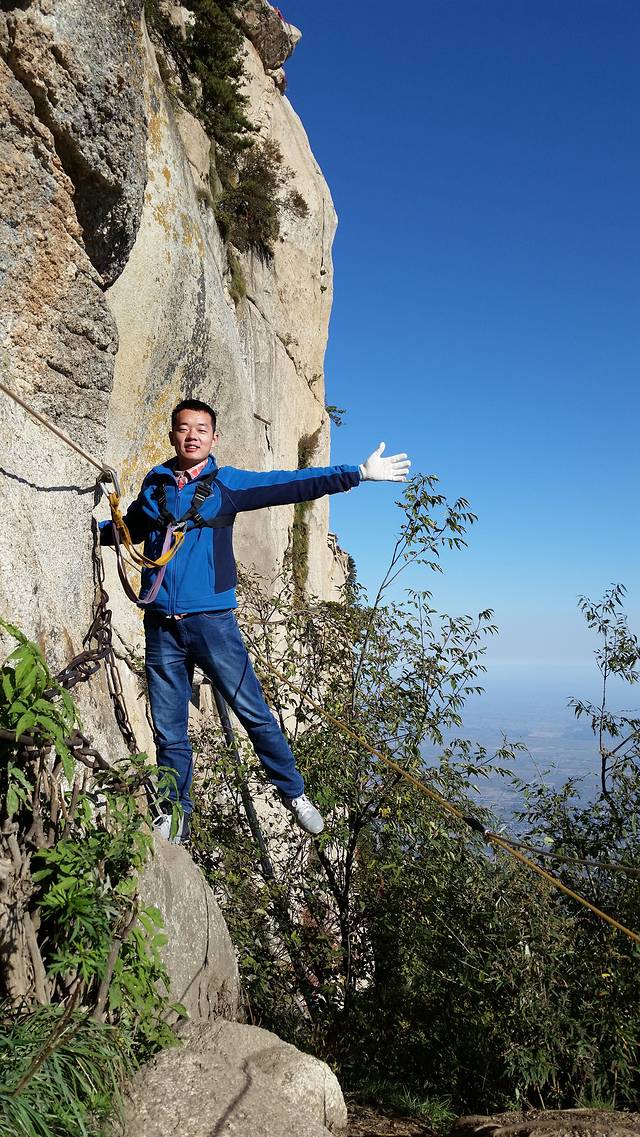 昨天互相鼓励着玩了长空栈道,现在都下来了肯定觉得没啥,其实当时在上面等着错开人时,过于久的望着悬崖还是心有余悸的(大家的共同认为),所以当我们站在鹞子翻身旁往下看整个鹞子翻身的行程时心里还是有些退缩,因为日夜温差大,腿也不听使唤的打着颤。又是一阵鼓励后,我们寝室七人都决定下去一探究竟。我在这不详细赘述鹞子翻身,其就是有个地方需要你仰翻一个动作才能下到崖上,难度系数比长空栈道略高。价格也是三十。下去时是不准你照相的,需要工作人员给你拍,小的三十,大的六十,大的可以给你电子版底片,直接蓝牙传输。其实我觉得按照工作人员教的动作不好看,也看着不险,在询问之后,才知道,一是这个季节下面有树,这样照下来确实没有样片中光秃秃的看这险,二是样片是请体育运动员拍的,姿势舒展优美,一般人是摆不出的。不多说了上图吧。