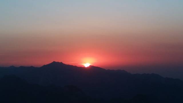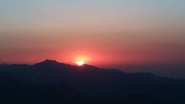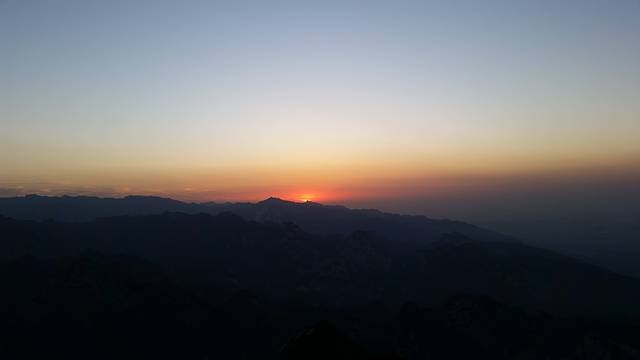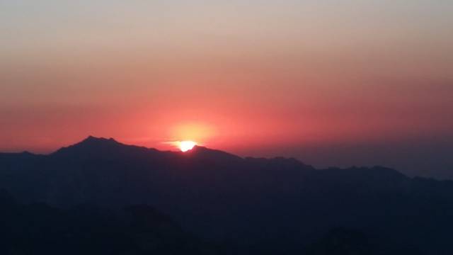 待到五点多时,已经有很多人登上了观日台,真的是寒风呼啸,我穿的冲锋衣都不管用,小L还租了军大衣也是无济于事,我把我带的棉衬衣借给了S哥,我们躲在一个背风的凹槽里等大家欢呼,再进行观日。六点四十左右,日出东方,感觉和看日落心情是一样的,已被冷的无话可说,草草的看完就准备回旅馆准备迎接鹞子翻身(鹞子翻身就在东峰饭店旁)。(因为太冷很多看到太阳露头后就稀疏下观日台,结果后来人越来越多,观日的不亚于十一,人挤人人挨人,许多下去的在路口的路牌处徘徊,思考往哪儿走,特别是夜爬的,有的自己下来了,女朋友还在上面就站在路牌那儿等,那里正对下来的人群,如果一个不留神脚滑,一个推一个,摔下崖真的是可能的。大家的安全意识真的很差,真不怪我想象丰富,我所在的城市是景区,容易出事的原因就是这样。我上次还在上海遇到一次电梯上站着等人,堵得差点出事的。)