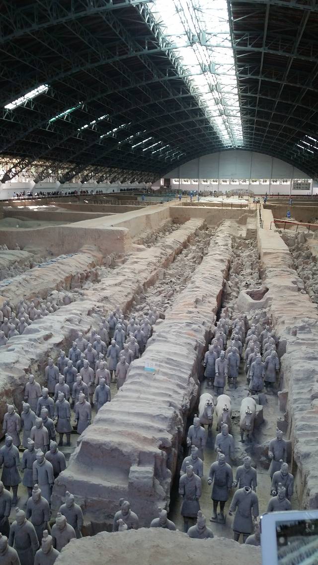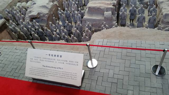 下面来说我的行程,等到了兵马俑下站后,往右走,再左转,再右转差不多就到了售票口,提醒千万不要买去哪儿网等网上售票的景区门票加手绘地图,那地图也是坑得一逼,最多值一元钱,卖了十元,毫无手绘性质,不如选择网上的门票加导览仪。现场门票150元,网上也没有优惠,导览仪30元(在网上好像可以便宜十元,套餐那种,就是门票加导览仪),押付100元押金,随便在出口的任何一个导览仪归还点还都可以,导览仪到了出口有归还的点会不停的叫,所以你不用怕忘了。现在来说说导览仪和导游的问题,如果你真心喜欢历史,那么请个导游还是能听到很多特别的东西,例如那个国家元首来看过啊,挖掘时的趣闻啊,网上的谣传啊,有文化有知识的还可以对导游问东问西,有钱没处花的哥们请导游还有一个好处的就是一人出行导游可以帮你拍照,哈哈哈哈哈哈,而只是想了解一下的就这样听听导览仪就可以了,导览仪可以回放,还是不错。别想着蹭导游,里面可多人了,都是成团的,听不清,成团的讲的可快了,一不留神就讲完走了。然后咱再来介绍一下兵马俑门票涵盖的精华,一是兵马俑,就是三个坑给你看,一号坑、二号坑、三号坑,看完你就可以出门直奔中转公交,景区内有标志,可以问工作人员、售卖导览仪的人员、志愿者等都能问到,乘坐免费打中转车到只有五分钟路程的秦始皇陵,秦始皇陵里面很大,如果你脚力很好,时间充裕,就可以直接不行进园,慢慢观看,如果你行李不多,又会骑车也可以选择租一辆自行车,悠闲自在的进行,如果东西多时间紧走不动道了,你也可以购买一张电瓶车票,以车代步,但是要提醒,电瓶车票要在进园后不久就购买,如果你在园内走完走不动了,想乘坐电瓶车那可不行,工作人员会要你出示进园后购买的电瓶车票据证明。再说说秦始皇陵的看点,秦始皇陵其实就是座公园,里面也是几个坑,但是坑里能看的东西少得可怜,人也少,歇歇脚,照照相还可以,因为秦始皇的陵墓还没有开始挖掘,所以这里也没啥看的,小情侣骑骑车散散步,亲子玩耍,陪爸妈聊聊天还是不错的。