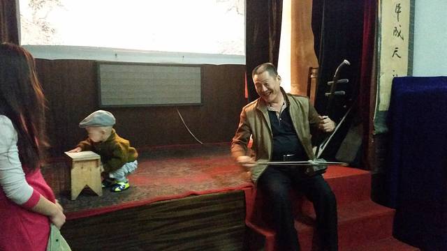 既然我为看皮影而来,我一定也就买了一张门票,还购买一张皮影票,结果进去一看就傻眼了,演的三打白骨精,里面除了牙牙学语的小屁孩,就是我了,而且整个故事持续不到五分钟吧,皮影没看见关节活动,实在说不上精彩,但是你从节目结束后表演的老人拉二胡逗小孩的情景看,老人还是有些技艺的,只是确实没展示出来,我之前在网上做攻略,看见都是看的三打白骨精,也是醉了。