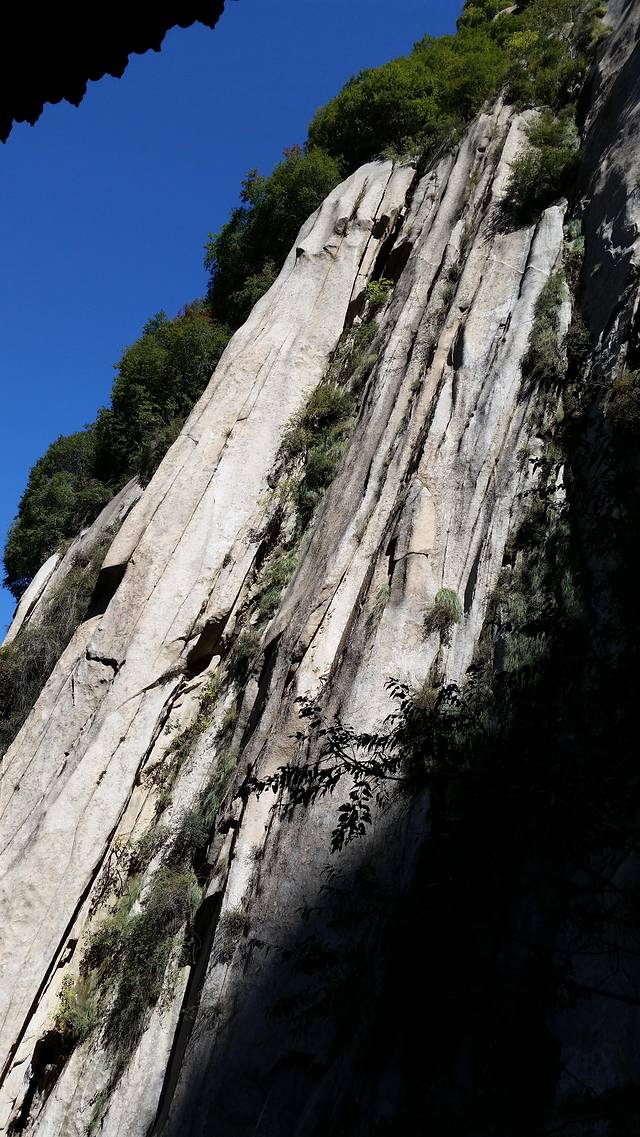 这里也有个趣事,因为回和去的人会在长空栈道上进行交错,为了方便我就在栈道中间有个石槽的地方把头伸了进去,这样身子可以贴着石壁,方便大家过路,石槽里原来应该是放神龛之类的吧,现在是空的,我就这样静静的等着,结果没有一人过来,安静了许久之后,终于有人好奇的发问了,哥们你们有什么东西吗,我也想看看,接着又有人问您是在凿石壁吗,还有人问你是睡着了吗,结果我说是为了大家好过路啊,气疯又欢乐起来。(这里还要说明长空栈道是可以带手机的,但是请自己要注意哦,滑下去掉进悬崖手机没了是小事,砸到人了就不好了,请拿稳喽,所以长空栈道你是不必花冤枉钱,让景区工作人员给你照的,其实他们技术真的不好也不坏,见仁见智哦,万一你的照相技术还不如他们呢)