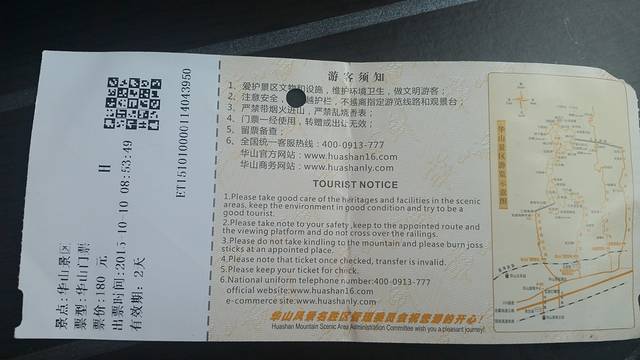 从华山牌坊前开始就不断遇到豪爽的重庆人,华山门票180元,本来是要收保险费的,但是保险是没有你名字的,中央台已经曝光过这样的行为,无疑这种就是贪污,保了也白保,也没和她理论,也没买保险。票管两天,进门会录指纹,即便因某些原因出景区,也是可以再次在两日的时间内进入的。