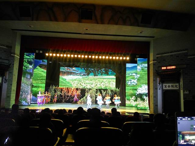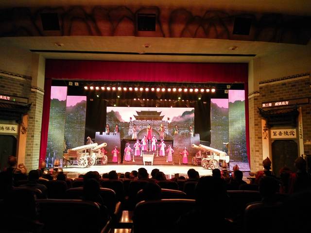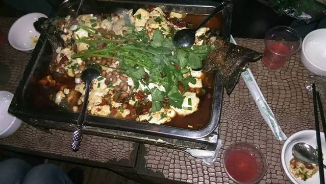 从山上下来,直接坐车回旅店。在旅店老板那里拿到晚上的演出票(窗口票价120元,网上提前一天购买有优惠75元一张,当天100元一张,因为我们是当天决定的,所以叫旅店老板帮我们定的,80元一张)。剧场就在新大桥口,8点开演,大概演出1个半小时。看完演出后我们就到新大桥下面的{罗满娘豆花烤鱼}店买烤鱼。我们烤了条江团(48一斤)三斤半,打包回旅店大厅吃(事先需要跟旅店老板沟通好,征求老板同意,我们来的这几天天气冷,在江边坐着太冻人了,所以事先和老板说了)因为还需要下边的炉子和碗筷一起租借,交了一百块的租借费。在旅店下边的大厅吃着烤鱼,鸡尾酒还有电影,两个字:享受~