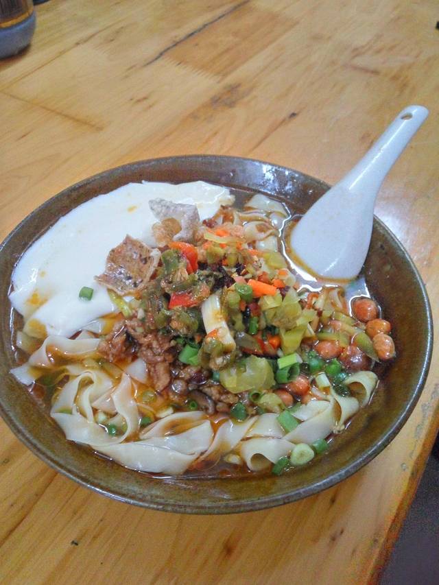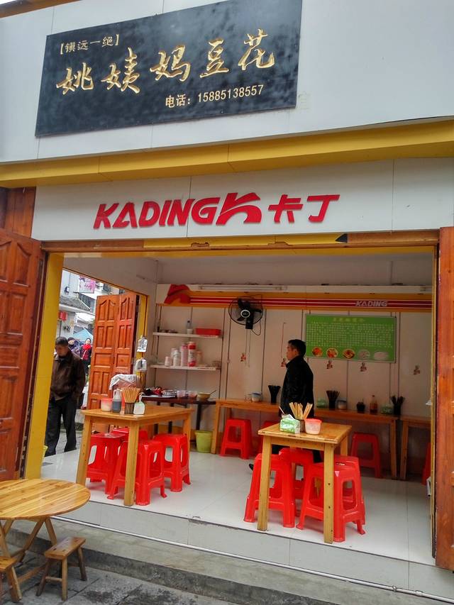 早上是吃旅店老板推荐的特色早餐——姚姨妈豆花,店就在城门洞口。我们四人点了四种,推荐吃绿豆粉,很好吃,配料自己放,。8元一碗