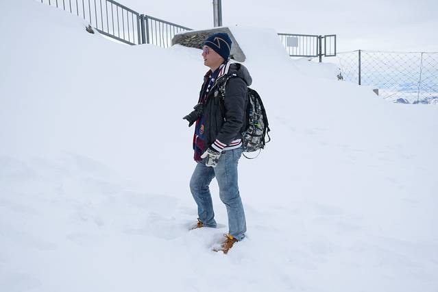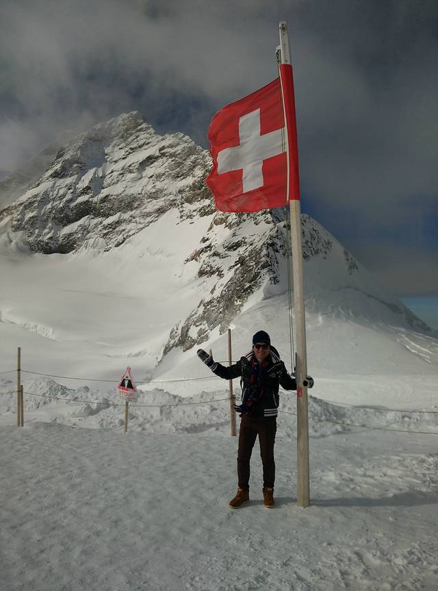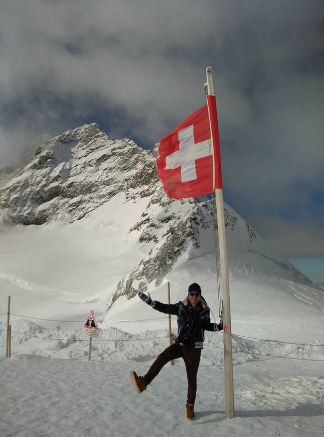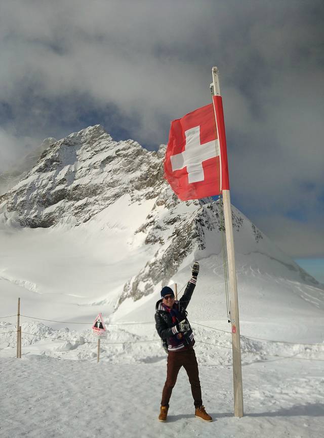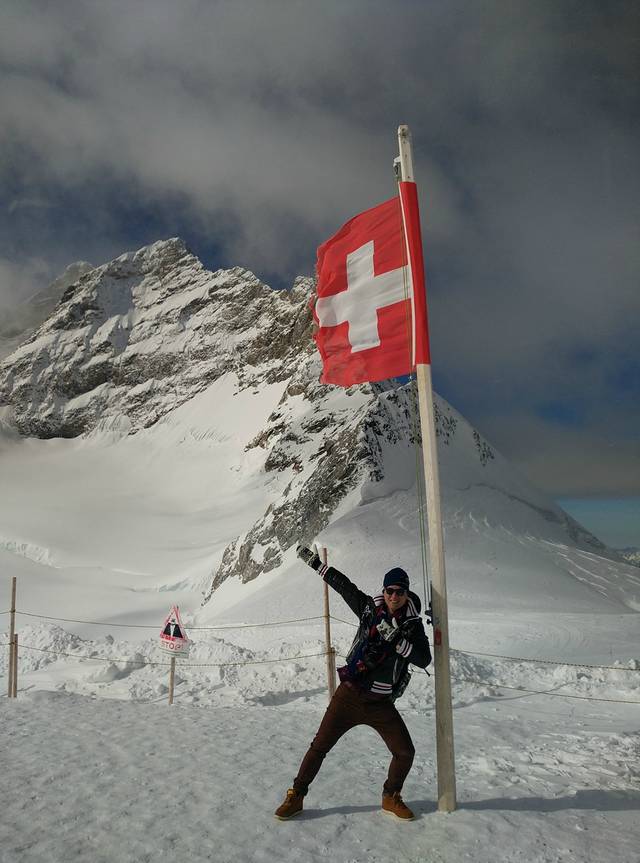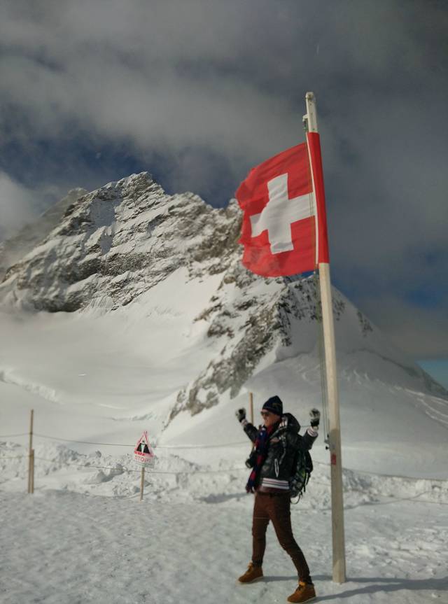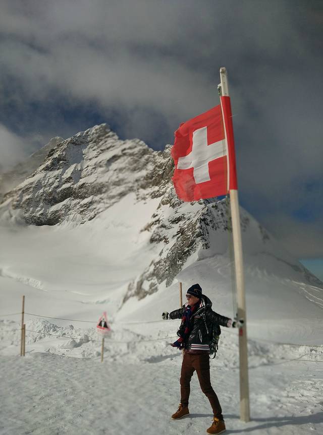 继续往山上走会来到一个有瑞士国旗的地方,这里就没有路继续向上了。应该是能步行到达的最高点。好大风啊,冷到鼻子都没感觉了。老实说我长这么大真的是第一次感觉到自己鼻子没了,就是摸自己的鼻子的时候跟没摸到一样,鼻子麻木了。