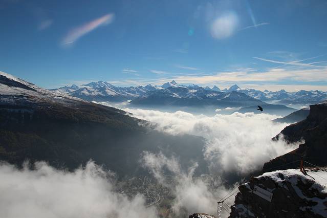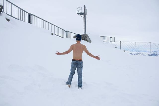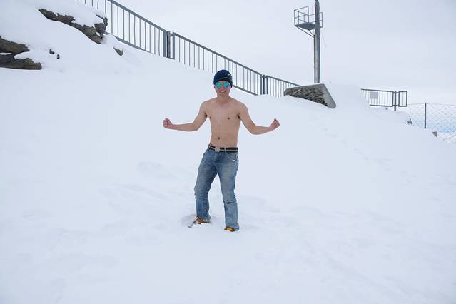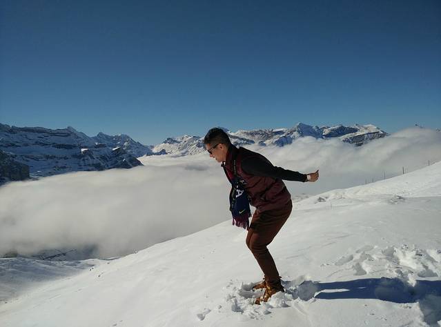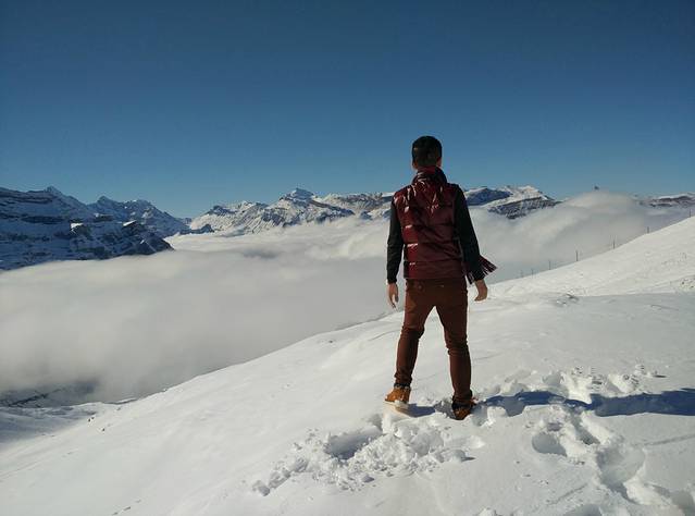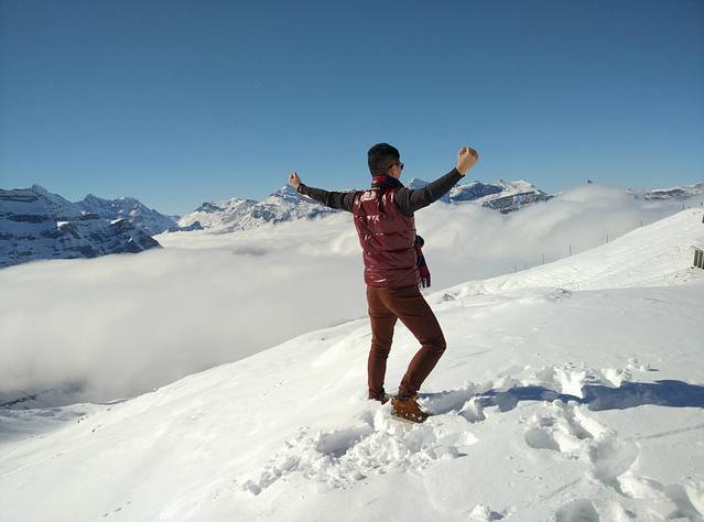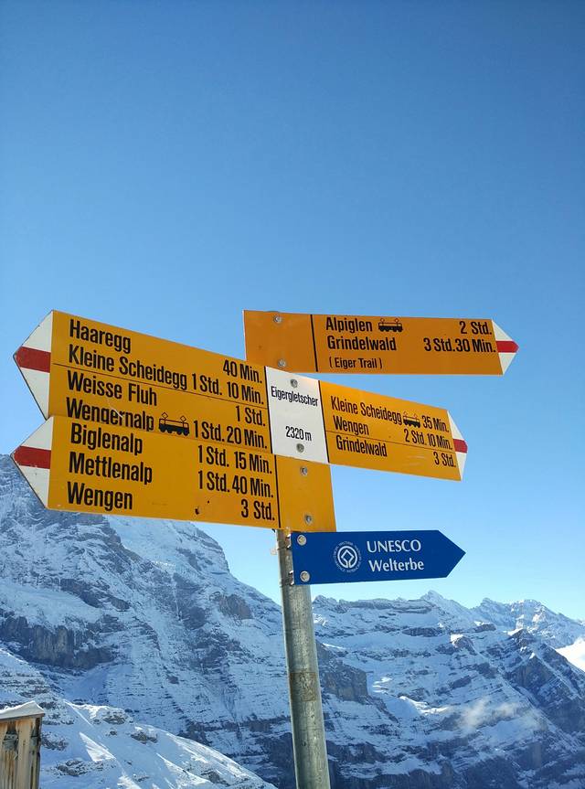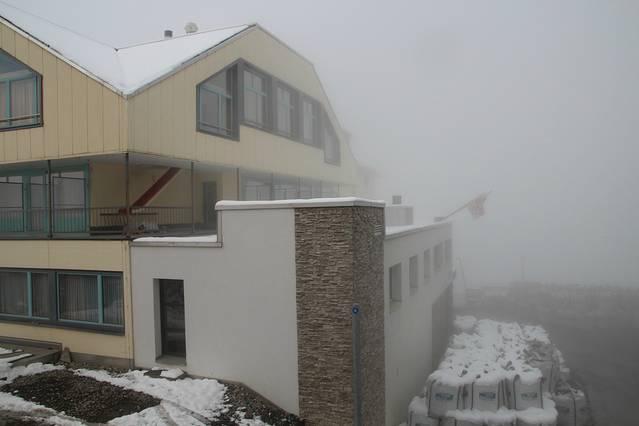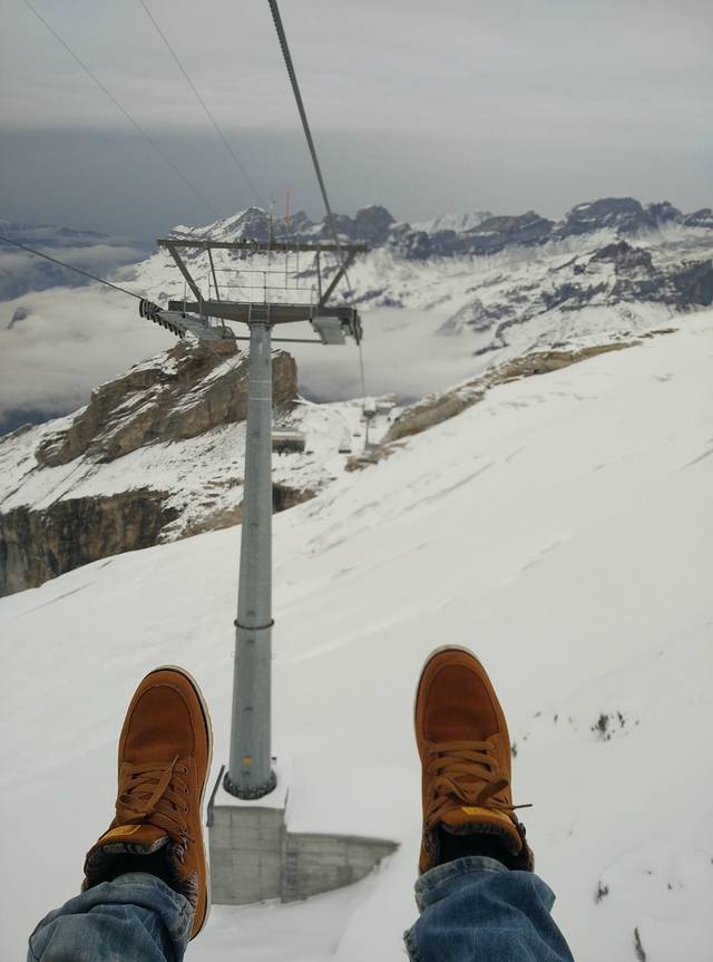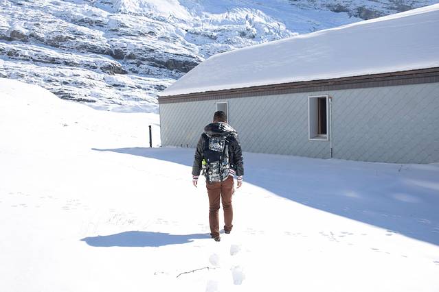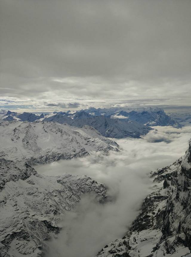 继续往山上走会来到一个有瑞士国旗的地方,这里就没有路继续向上了。应该是能步行到达的最高点。好大风啊,冷到鼻子都没感觉了。老实说我长这么大真的是第一次感觉到自己鼻子没了,就是摸自己的鼻子的时候跟没摸到一样,鼻子麻木了。