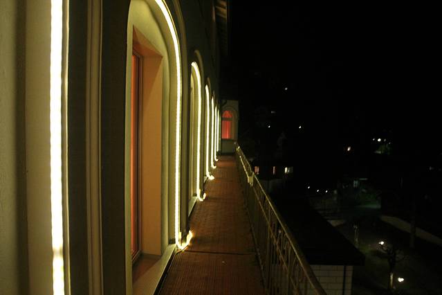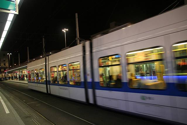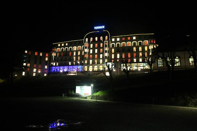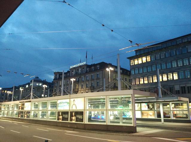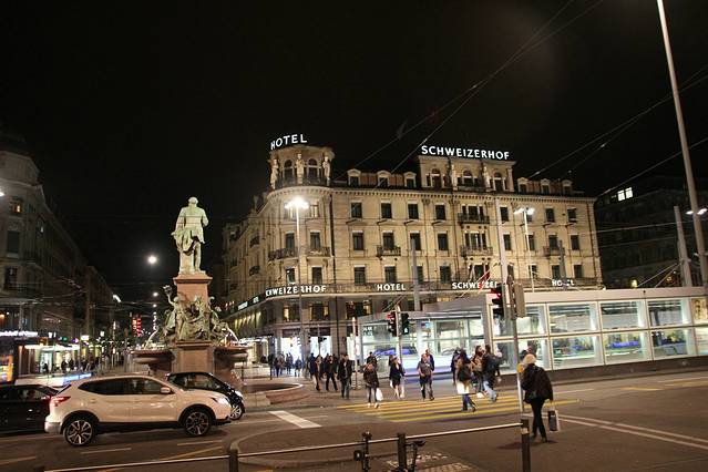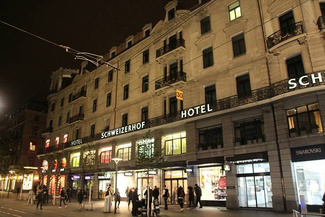 我们的酒店Schweizerhof夜景外观,门口是个电车站点