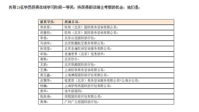同样成功通过课程学习的旅游从业人员,也有机会免费去瑞士,而且这个名额更多,我在网上查到刚刚发布的幸运儿学员: