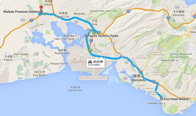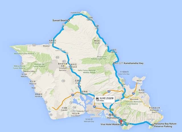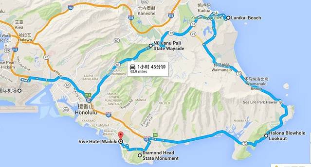 住宿在威基基海滩周围是最佳选择。因为从最南到最北,也不过80公里。当天来回完全没问题,并且岛中高速H2转99,都很好开,不用担心。