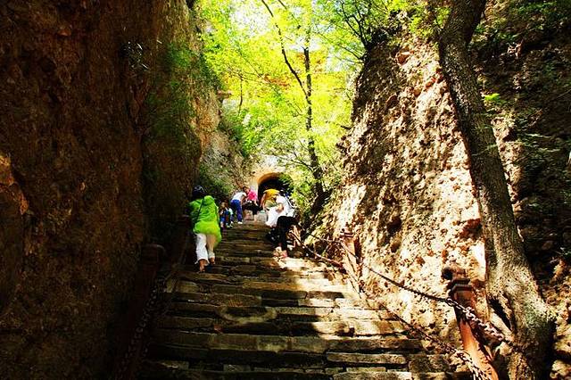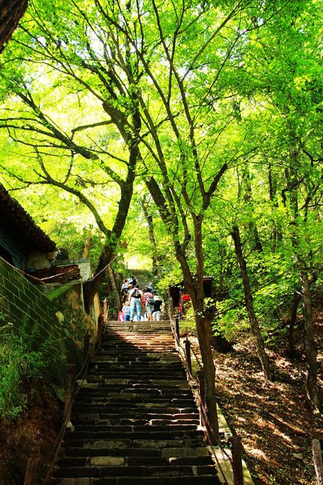 在朝天门二次检票后,刚进入山门,迎面就是一段陡且高的石阶。一路经过药王洞、蜡烛峰,到遇真宫后,抬头一看,是一段更高、更陡的台阶,名曰“上天梯”。