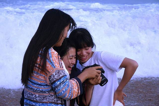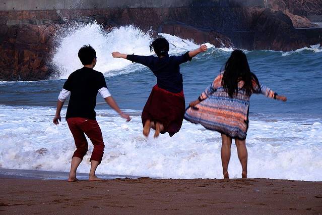 他们三在拍打过来的浪里想捡到漂亮的贝壳。
