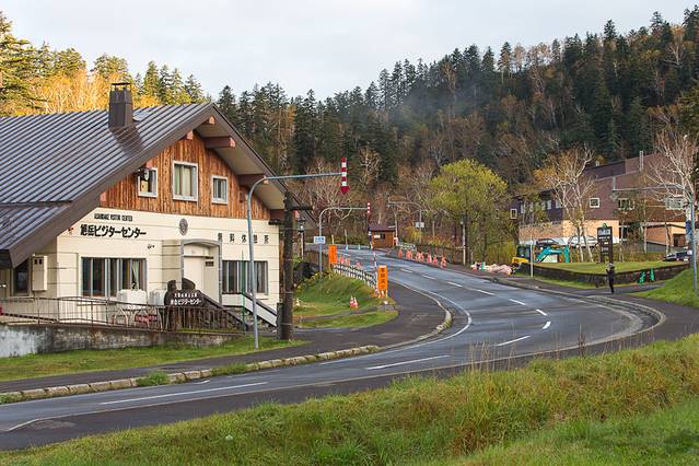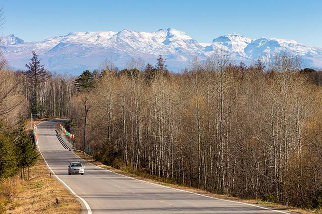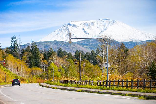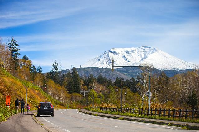 来到大雪山旭岳两天,这两天几乎一直下雨,没有看到旭岳顶峰的真容。早上拉开窗帘一看,外面阳光明媚,赶紧穿上衣服拿好三脚架和相机跑出去看,只见公路的尽头,一座白茫茫的雪山出现在我们眼前。连续两天的降雨,让山顶笼罩了一层积雪,雨过天晴,旭岳终于露出了真面目,秋日的假期里,一家日本游客下车眺望北海道屋脊的壮观景色。