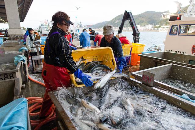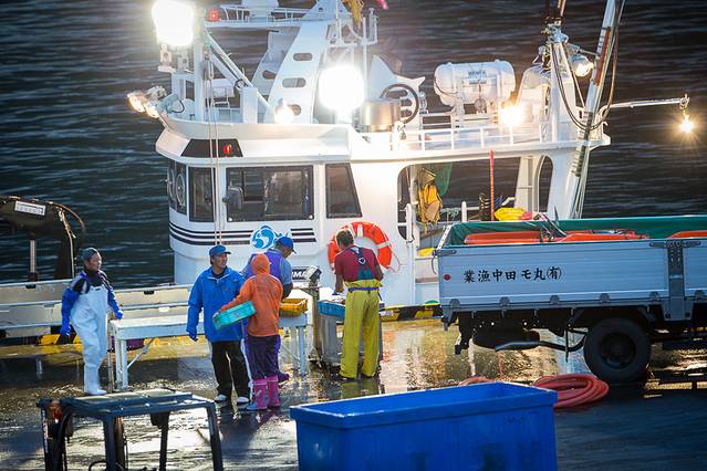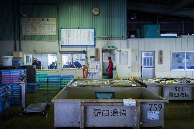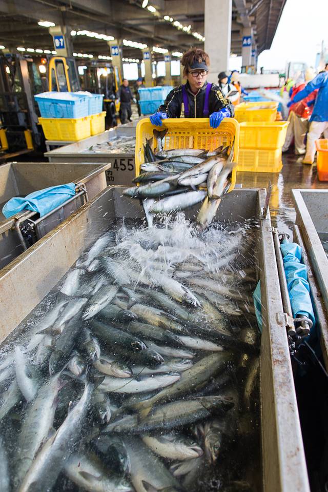 我们来到罗臼渔业协会参观,正好赶上满载鲑鱼的渔船回港,工作人员正在按照鲑鱼的品相分拣,分成好几个档,装在不同的水箱里。水箱用冰块保温,再用叉车运走。分拣时有时会发现“鲑儿”这样的极品鲑鱼,鲑儿是太平洋鲑鱼里最名贵的一种,脂肪含量比普通的鲑鱼多出20-30%,由于鲑儿洄游路线与其它鲑鱼不一样,所以不经常在北海道东部沿岸出现,它们的故乡在黑龙江乌苏里江,中文的名字就是黑龙江大马哈鱼。洄游黑龙江需要逆流游900公里,所以鲑儿的脂肪含量要远远高过普通的鲑鱼,是很正常的。