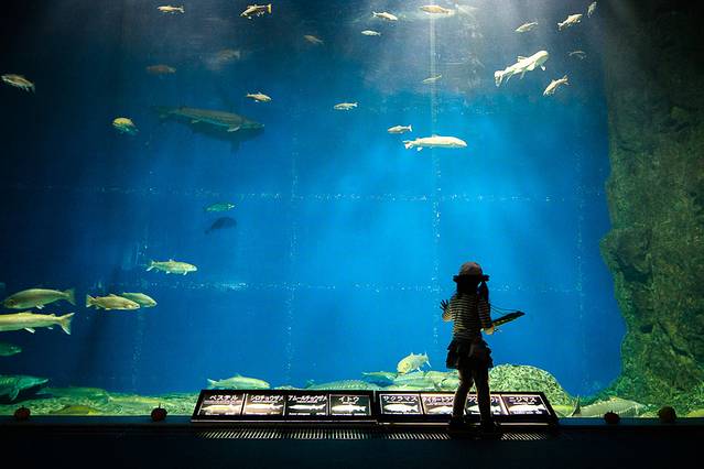 千岁鲑鱼故乡馆(千岁鲑鱼博物馆)的水箱前,一名小学生在观察鲑鱼、虹鳟、哲罗、鲟鳇鱼等多种大型淡水鱼类。