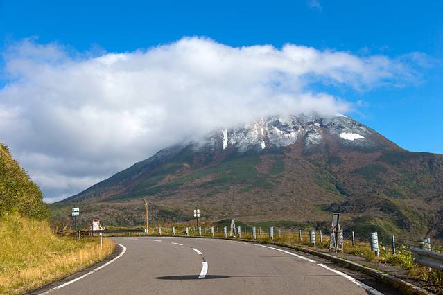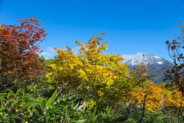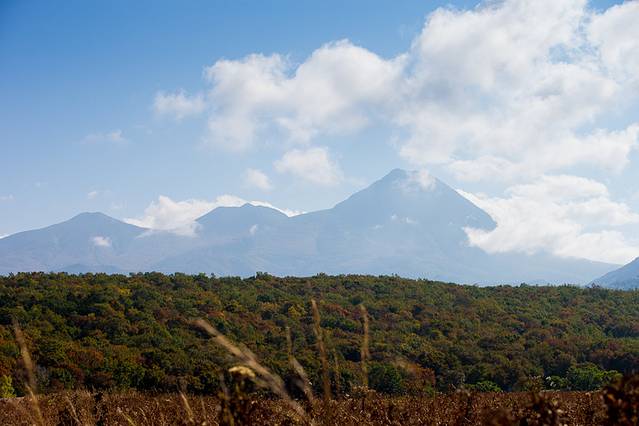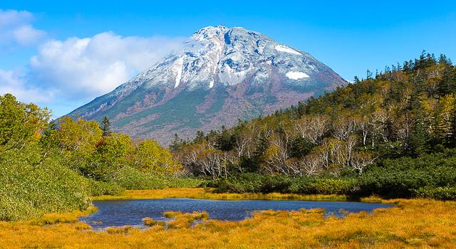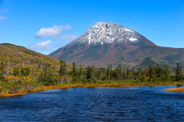 被誉为知床富士的罗臼岳,山上积雪,山下充满了秋色。