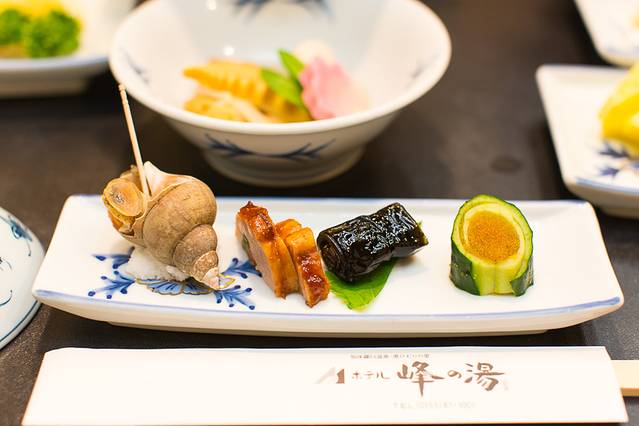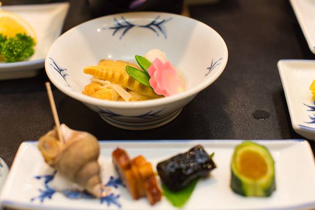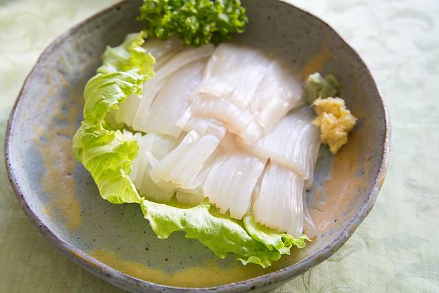 这盘鱿鱼是早上刚从罗臼渔港打上来的鱿鱼。我们在第二天早上去罗臼渔港参观,渔师们送了我们一大条刚打上来的鱿鱼,回来酒店就帮我们把鱿鱼做成了刺身,一般冷冻鱿鱼的口感都是很硬很有弹性的,但新鲜鱿鱼的口感很柔软,一点也不硬。关于渔港的故事,我们接下来再叙。