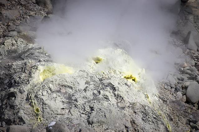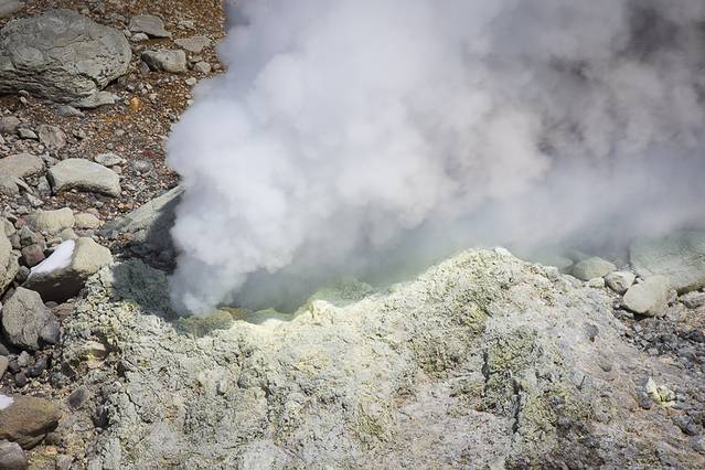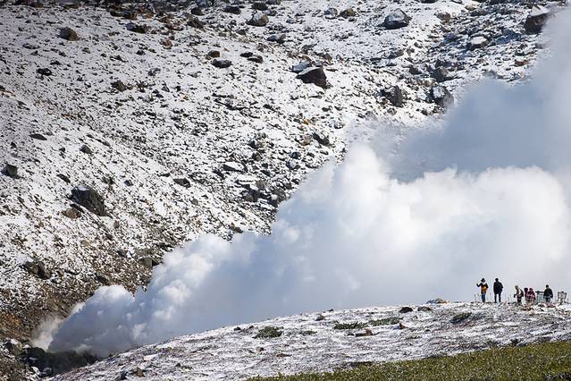旭岳的火山气体喷出口。山顶的喷气口常年热气喷涌,一些游人走近喷气口的周围,感受火山的力量。