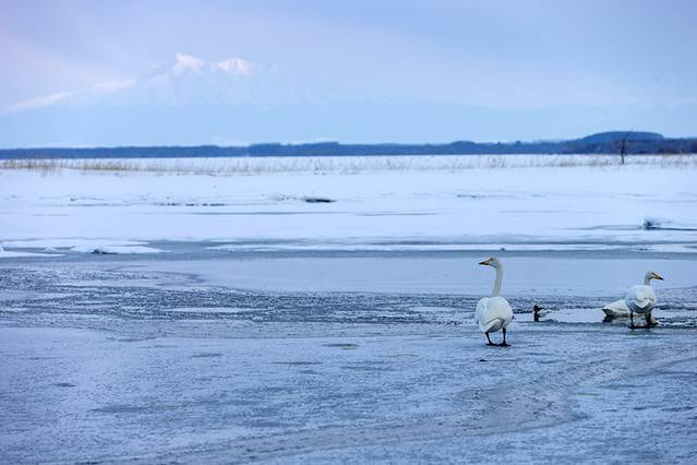 寒冬的网走涛沸湖,从西伯利亚来到这里越冬的大天鹅,远方是斜里雪山。