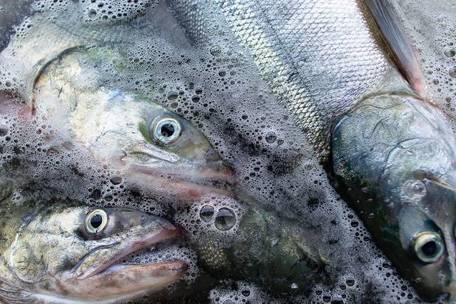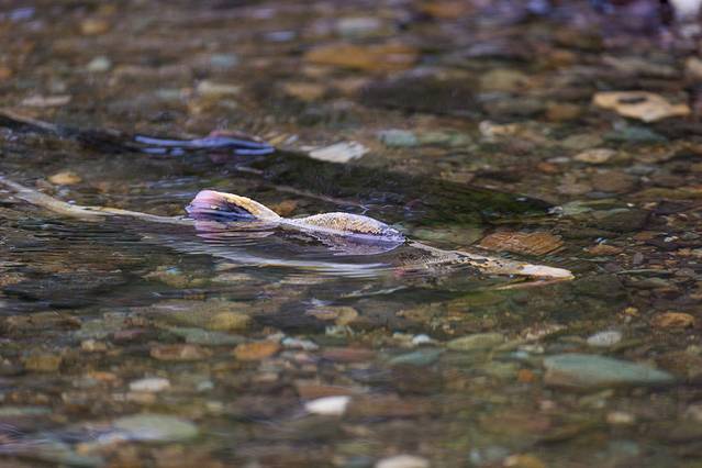 正在洄游中的鲑鱼,已经精疲力尽,奄奄一息。