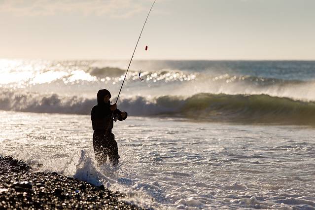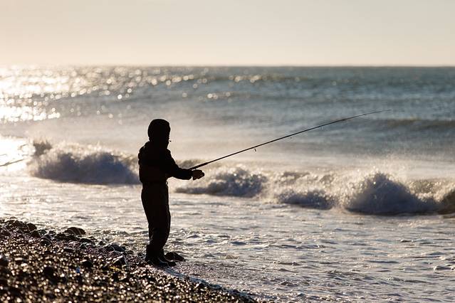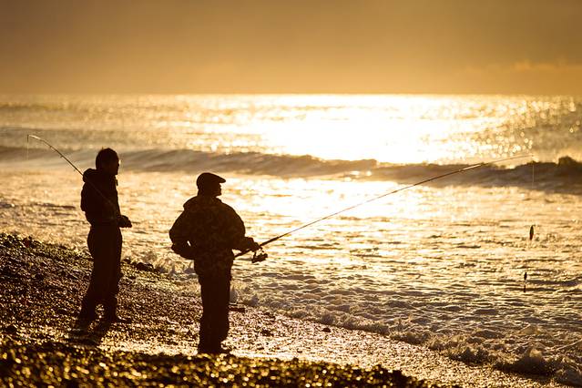 海边钓鲑鱼的人。夕阳让鄂霍次克海滨披上一片金黄的色彩,这一切仿佛电影里的场景。
