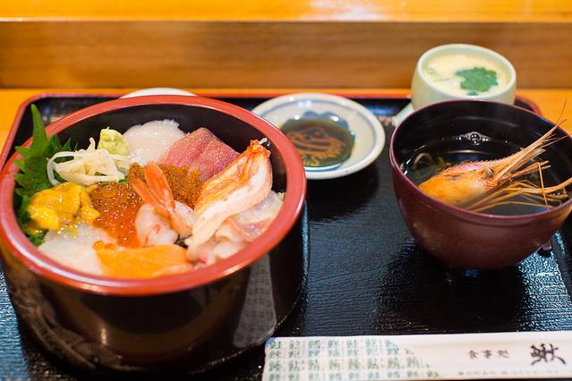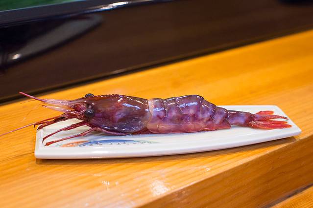 这家店里最推荐的料理,就是图上的这只色泽和肉质都很饱满的大虾。这种虾是日本最高级的食材之一,因为颜色像葡萄,被当地人称为葡萄虾,葡萄虾的学名叫做林氏异腕虾,是一种分布于北太平洋的深海虾,据说遇到危险可以喷出蓝色光雾迷惑及恐吓天敌,因产卵量较少,葡萄虾的数量非常稀有,是一种非常珍贵的食材。