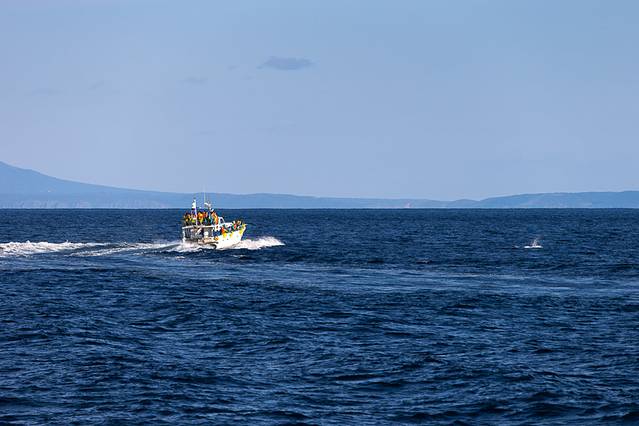 罗臼町最著名的自然体验项目是出海观鲸,知床半岛的东侧,也就是罗臼一侧生活着海象、虎鲸、海豚、抹香鲸等多种海洋哺乳动物,这个季节出现最多的是抹香鲸和鼠海豚。