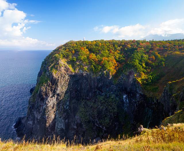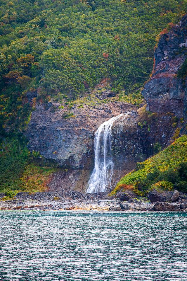 从知床自然中心出发,徒步穿过一片林地,直到知床海边的峭壁上,看峭壁上的FUREPE瀑布从岩石缝隙中流向大海。徒步往返时间大概一个小时。站在峭壁上,看碧蓝的鄂霍次克海上,有白色的渔船经过,心旷神怡啊。