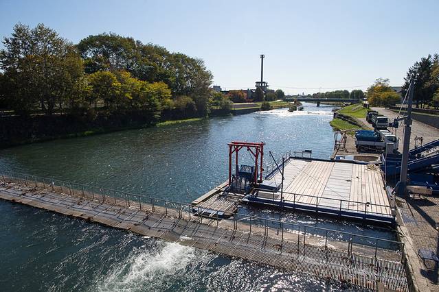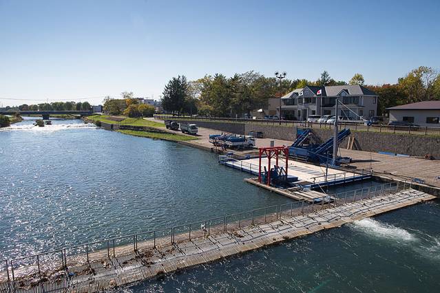 走出千岁鲑鱼博物馆的后门,旁边正是北海道重要的鲑鱼洄游地千岁川,河上建有一座水车,是用来捕捉鲑鱼用的,把捕到的鲑鱼进行人工取卵,用于人工繁育。