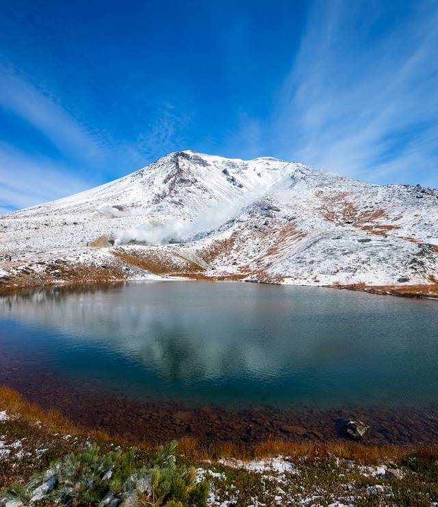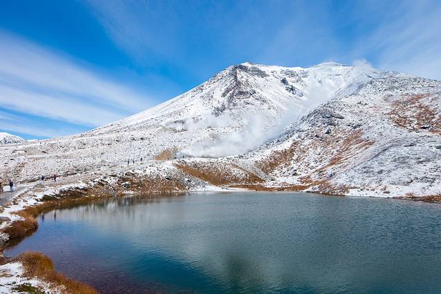 姿见池上方的旭岳,能够看出,热气正在从山体上的喷气口不断喷出。
