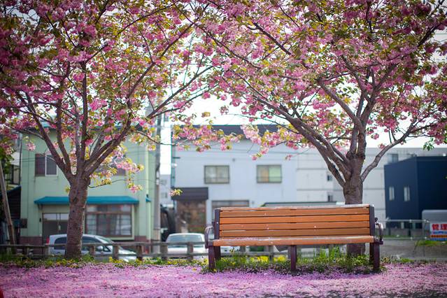 春日小樽的晚樱,旧手宫线铁道遗址,地面已是一片花瓣的颜色。