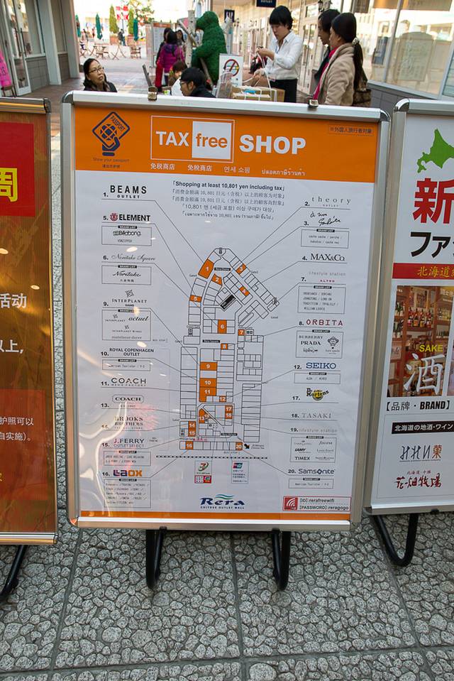 商城内的招牌,介绍了各个品牌门店的分布区域,免税店的位置,北海道特产店的信息。