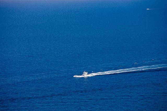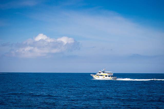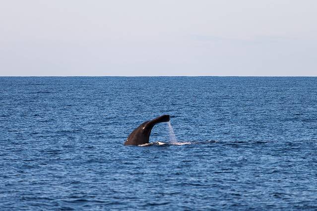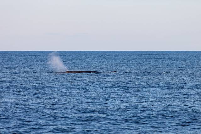 由于迟迟不见大型鲸鱼的踪影,观鲸船在海上关闭了引擎,声纳一直在忙碌的工作,确定鲸鱼的方位。不久,海平线尽头出现了向上喷起的水雾,船上的声纳也发现了鲸鱼唱歌的声音,观鲸船急速调转船头,开足马力向鲸鱼的方向疾驰。是一只巨大的抹香鲸来到水面换气,可惜鲸鱼的角度与船刚好形成了90度,我们正好对向了它的侧面,它甩尾入海的一瞬间,我只拍到了尾鳍的侧面,希望下次再来能从背面看见抹香鲸的尾鳍。