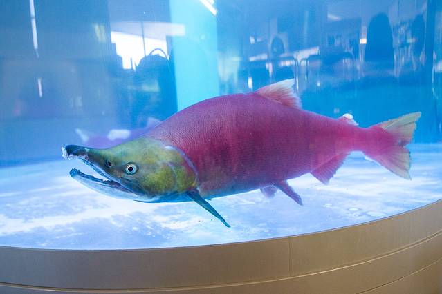 红鲑通常生活于北太平洋,产卵期洄游至阿拉斯加、加拿大西海岸、东西伯利亚沿岸、阿留申群岛、勘察加半岛、千岛群岛的河流。北海道的河道少有洄游,但红鲑另有终身不游到海里的陆封型个体,天然分布在北海道的阿寒湖等淡水湖,被称为姫鱒。红鲑的颜色其实是银白色的,只有在产卵期通体才会变成红色,水箱中的这条已经进入了产卵期,也快走到了生命的尾声。