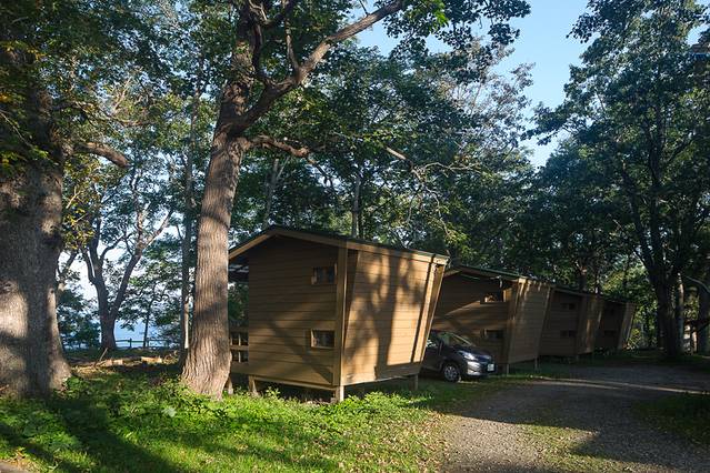我们回到了野营场,在宇登吕这两天我们选择了租赁森林小木屋来野营。每晚3200日元,但要自备防潮垫与睡袋。知床野营场就位于知床八景之一的夕阳台旁,在这里能看到知床最动人的夕阳。远处宇登吕海港的巨石也是知床八景之一的怪兽巨石。
