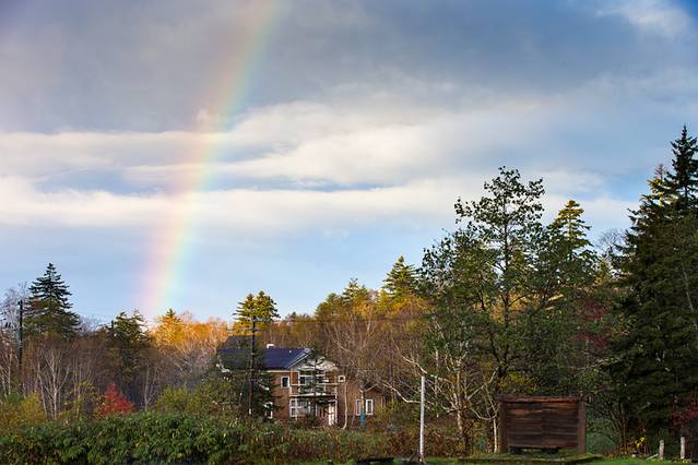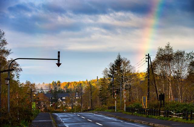 清晨,雨后的旭岳温泉,远处的林中升起一片云雾,一条彩虹出现在空中。