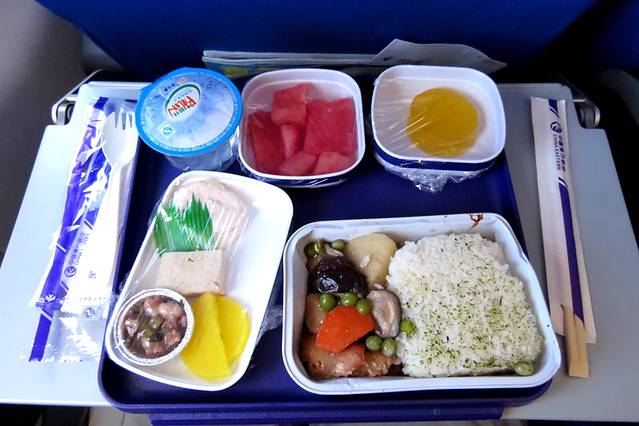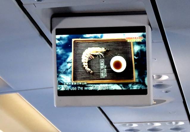 东航的飞机餐,我们正在吃的时候,上面的屏幕同时在放美食节目,这个有点反差。。。