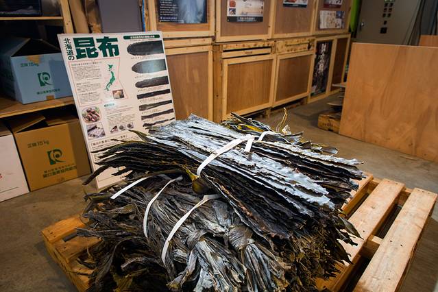 昆布仓库的老师傅,他送了我们几片干昆布,掰下来一片放在嘴里含着都很有味道,鲜美极了。