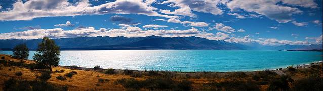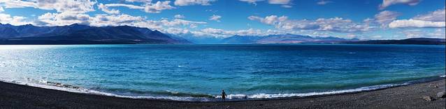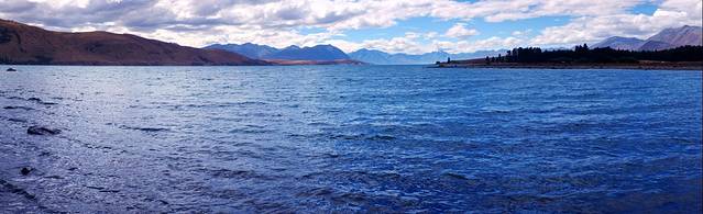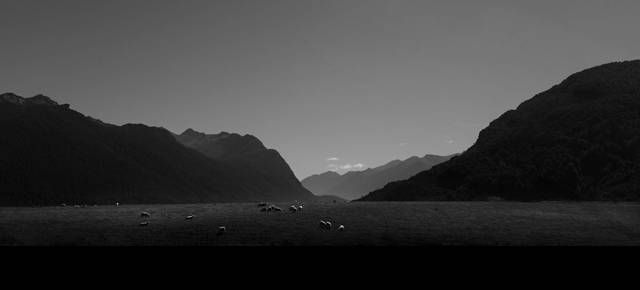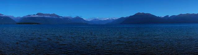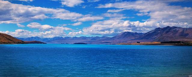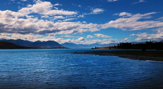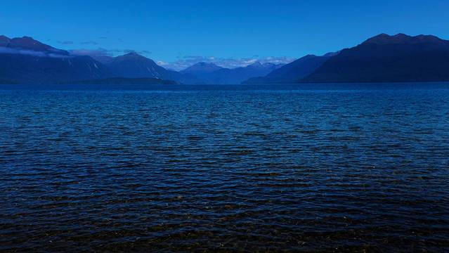 经过蒂阿瑙小镇之后,公路在一片草场之间穿梭,这里的丘陵地貌是上一次冰川期之后遗留下来的,蔚蓝的蒂阿瑙湖就是由冰川切割出来的。我们去的时间比较早,阳光还没有完全照进湖泊所在的峡谷。水面、群山和天空都笼罩在一片宁静的蓝色之中。湖边的露营地停着许多房车,真是很羡慕这些能伴着湖水入眠的人们。