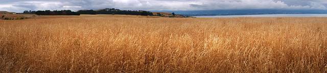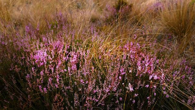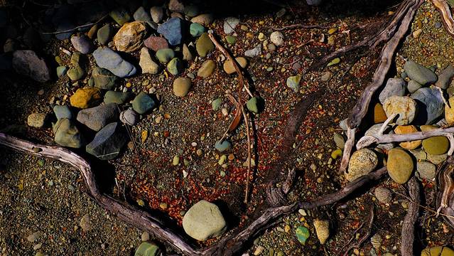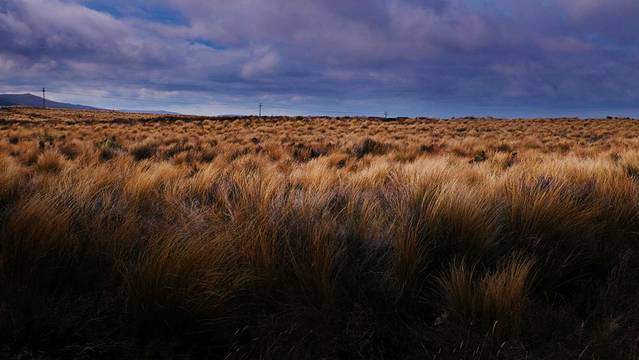 整个步道的西边(不分南北环线)都位于达特河和湿地之间的那一片广袤荒原上,因为远离湿地,所以满眼的景色都是一片枯黄的野草。野草中生长着一丛丛不知名的低矮灌木,它们或枯萎,或茂盛,但都因长年累月强风的吹拂而变得枝干虬结,扭曲而痛苦的偏向一边生长。偶有灌木稀疏的地方,就能看见达特河。达特河在进入瓦卡蒂普湖之前经过了一大片灰白色的砾石滩,河水变得平缓,河道变得破碎。顺着河道可以看见远方群山中她来的地方,那里蒙着一片白雾。