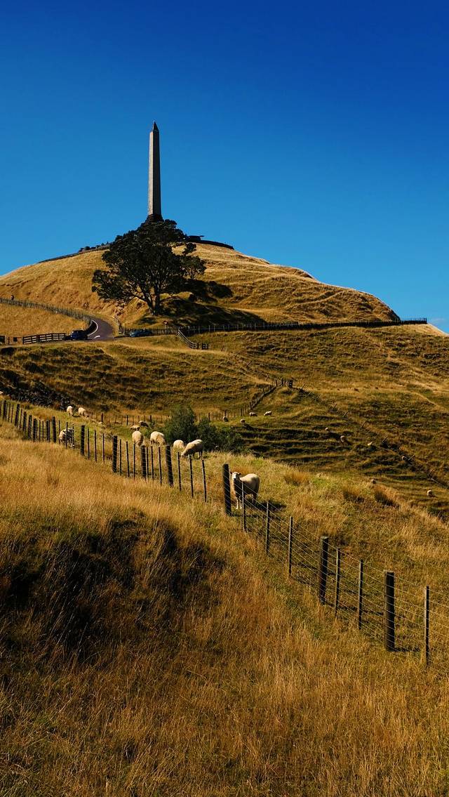 我们一直开车上到了山顶,站在方尖碑下奥克兰的风景一览无余。铺满荒草的山坡徐徐斜下,白色的羊儿点缀其间。
