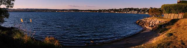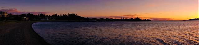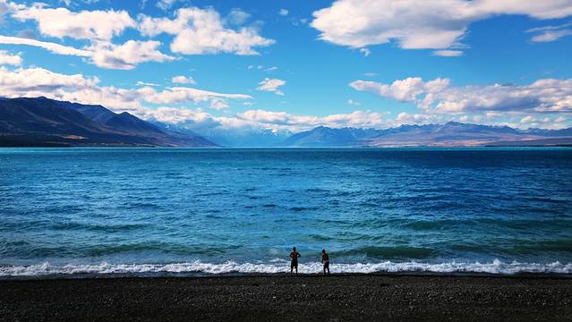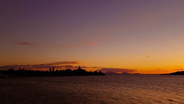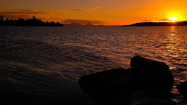 离开哈比屯已经是接近下午4点,一路走走停停到陶波湖都六点过了。酒店就选在湖边,办理完登记入住,一行人赶紧跑到湖边来等夕阳。这是我们在新西兰看见的第一个湖,也是最大的一个,湖水清澈甘甜,黑色的砾石细碎但膈脚,美丽的夕阳为这里加分不少。