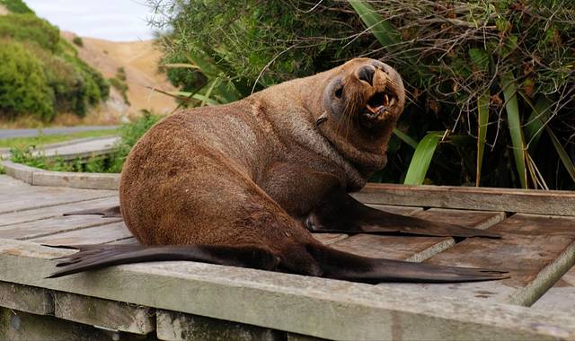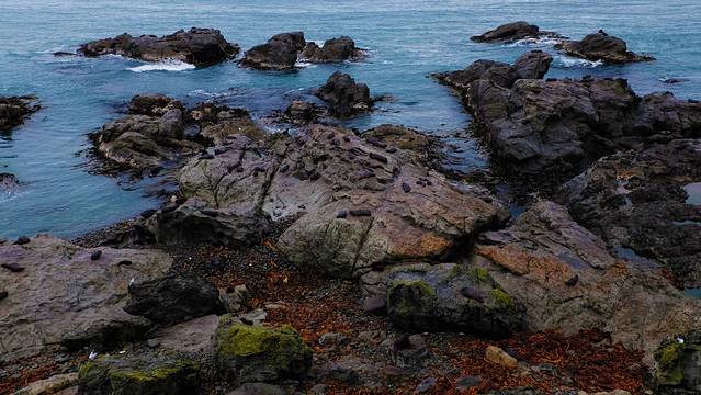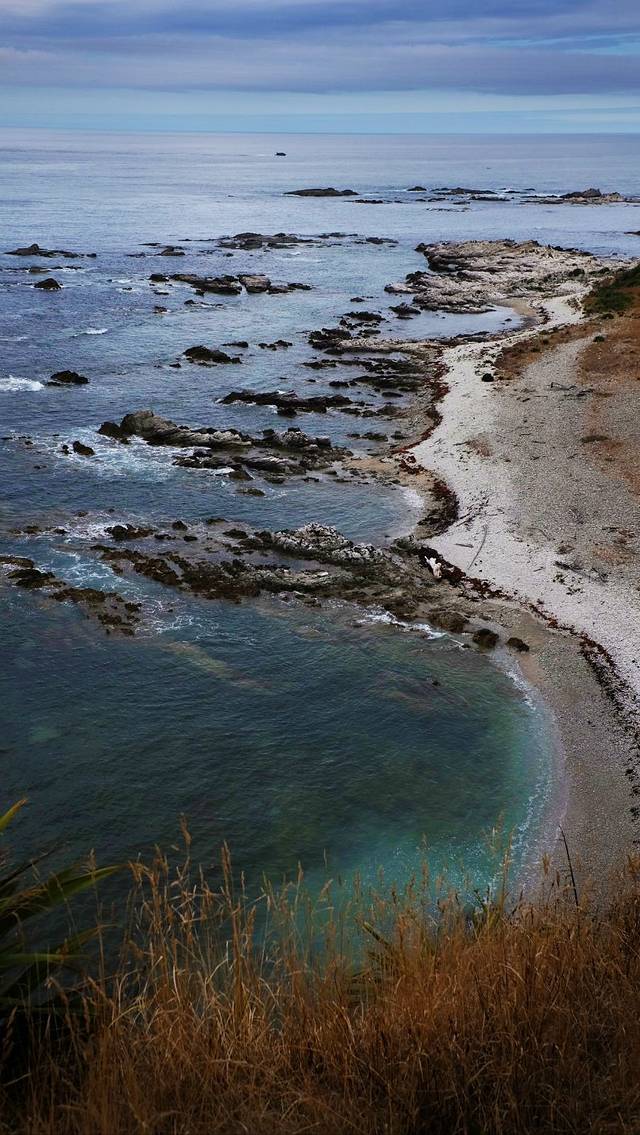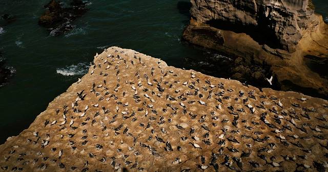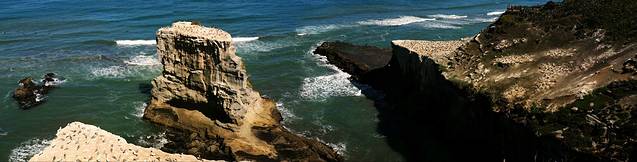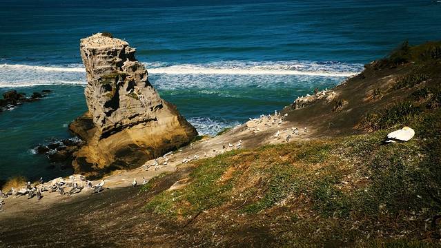 海滩南边就是新西兰著名的鲣鸟繁殖地。通过一条短行步行道来到位于栖息地主要区域上方的观景平台便可看见整个繁殖地。繁殖地分布在近岸悬崖以及几座孤立的岩石岛屿上,岛屿四面峭壁,直直的立在沙滩以上40米左右。每年8月至次年3月,有约1200对塘鹅在这里筑巢。巢与巢之间的距离只有几厘米,远看密密麻麻的略有一点不适。