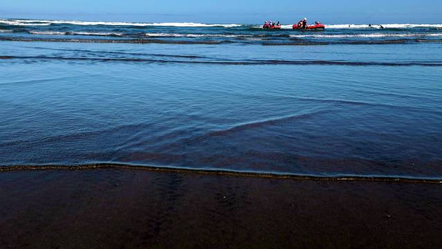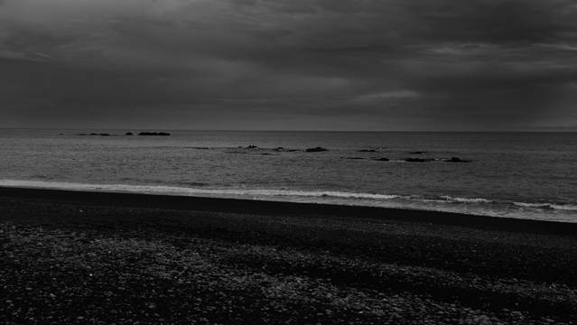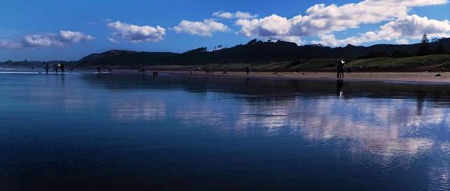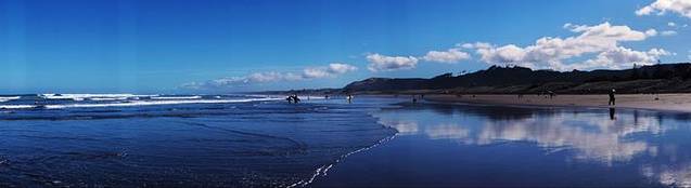 这里的沙滩平缓,砂质细腻,黑色的颜色是火山灰与沙石相混合后呈现出的颜色。由于沙滩平缓的深入塔斯曼海,所以海浪能冲到沙滩很深的地方,湿湿的沙滩变得如镜面一般映照着蓝天白云。